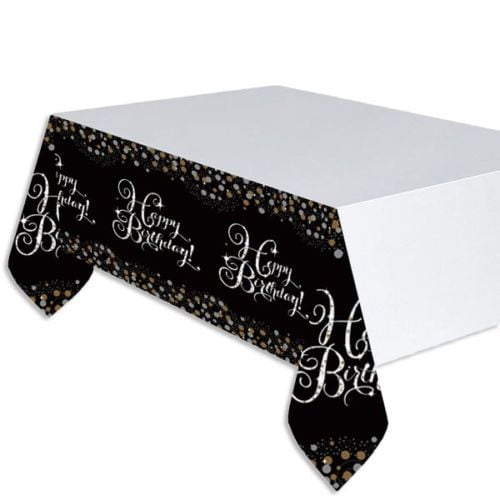 Toalha de plástico sparkling de 137cm x 259cm. Tema: Brilho dourado com inscrição Happy Birthday,