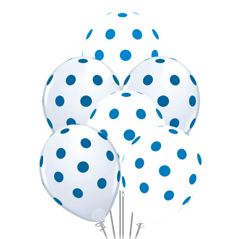 Embalagem de 8 unidades com balões brancos e transparentes com pintas azuis,